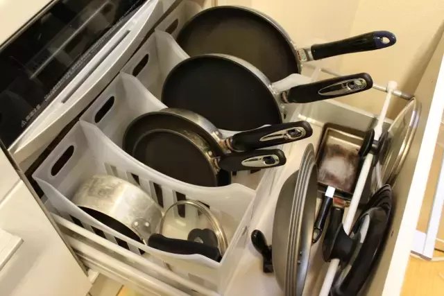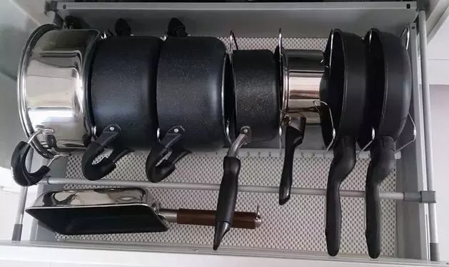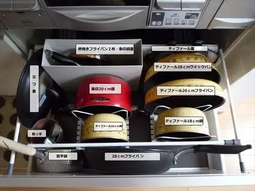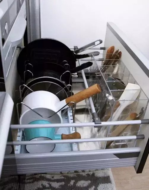 首先是锅碗瓢盆的收纳,如上图所示,日本太太们根据尺寸大小充分利用好了收纳中的空间缝隙,可以说拉开抽屉的一刹那足以震惊。