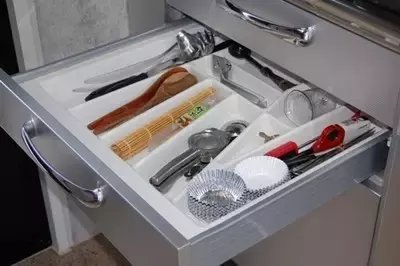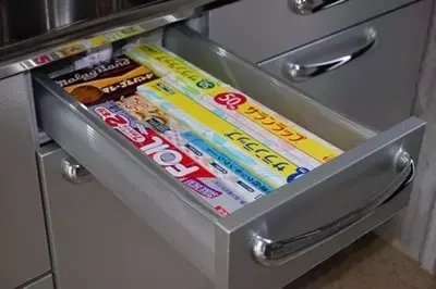 橱柜的抽屉当然也要充分利用,可以将保鲜膜和一些食用器具收纳在其中。
