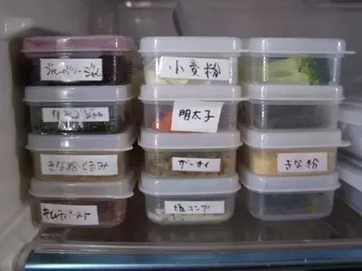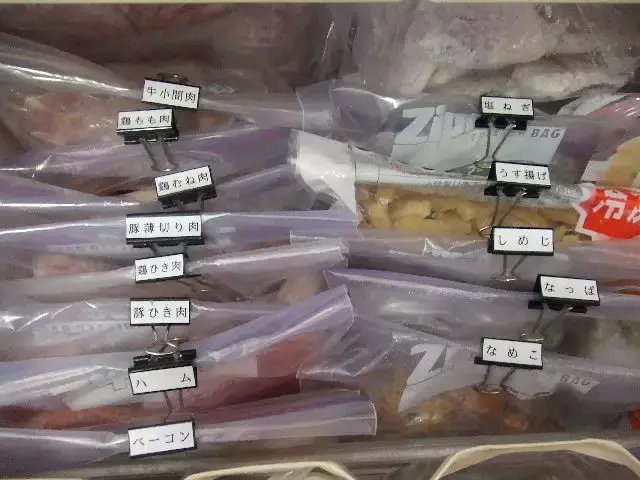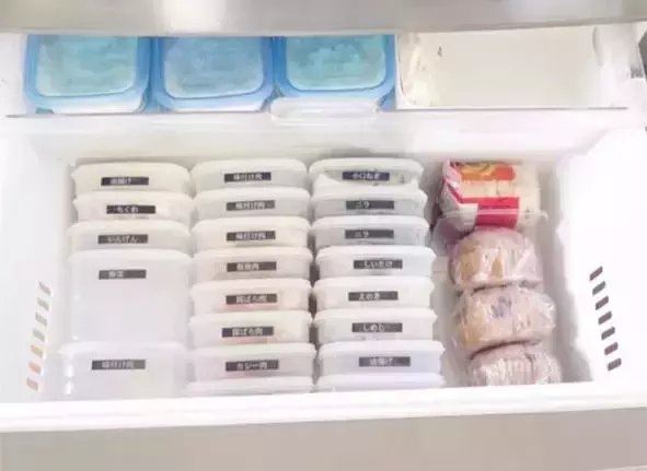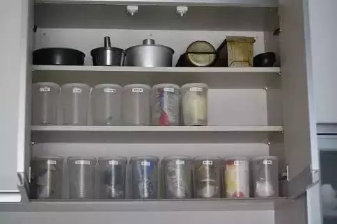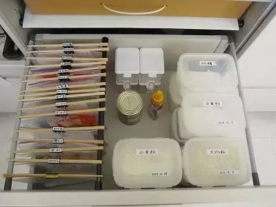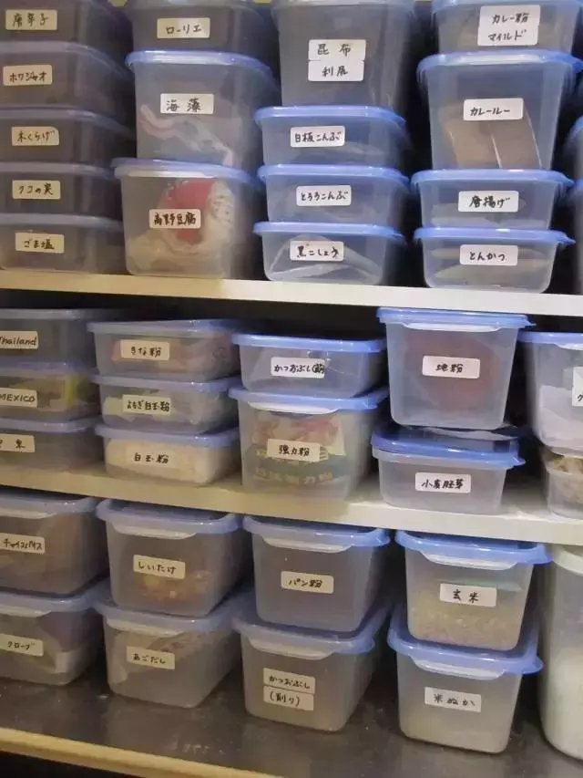 日本太太大多数都是买n多个小型收纳神器,然后根据食材的不同在容器上做标记,当然一定要挑选一些密封性高的容器,否则后患无穷啊~一般的食材保质期还是很高的,所以太太们可以选择性稍微多一些储藏。