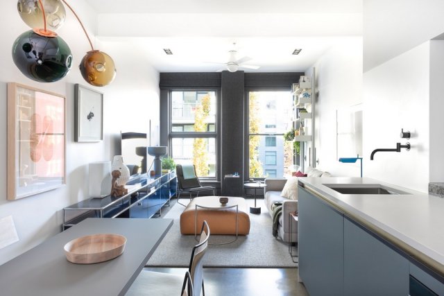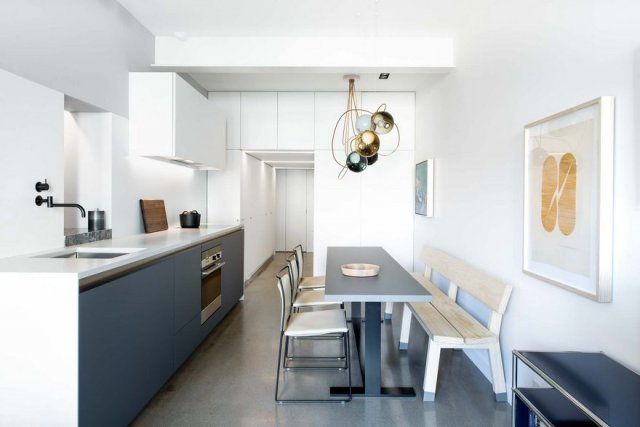 如今流行的开放式餐厅厨房,在这个小户型中也得到了体现,餐厅空间一边,放上餐桌和餐椅,即使空间不大,中间也留出了足够的走道空间,不会影响功能区的正常使用。