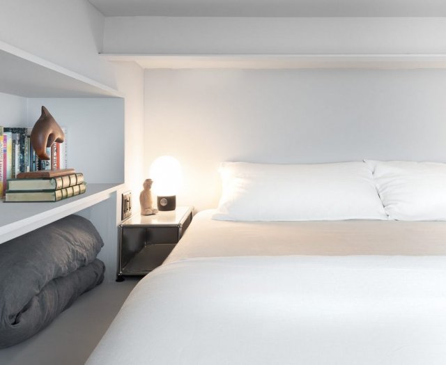 这点一般人想不到,竟然把卧室把卧室空间设计在墙顶上!利用层高,在屋顶上打造一个抬高的小卧室,内部空间无法供一个人正常站立,只能保证半人的高度,睡觉休憩没有问题。侧边挖上了内嵌式的壁龛,唯一一点不用担心的就是落灰问题。